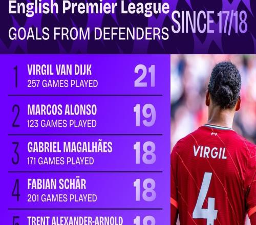 • 1718赛季至今英超联赛后卫进球榜:范戴克21球第一
