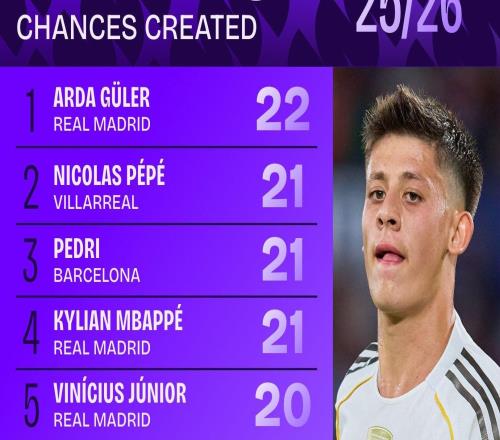 雷速体育10月7报道 外媒统计了本赛季西甲创造进球机会次数排行榜,皇马中场居莱尔以22次居首,尼古拉斯·佩佩...