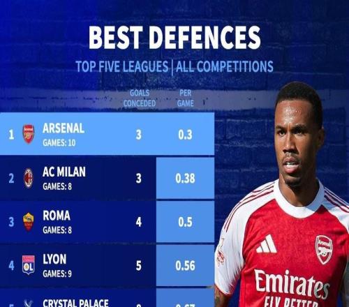 德国转会市场网站列出了本赛季五大联赛球队各项赛事场均丢球最少排行榜,阿森纳以0.3球排名第一,米兰第二,罗马...