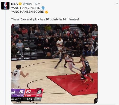 中国球员杨瀚森在第三节迎来爆发,单节5中5独得14分。杨瀚森的出色表现也引起了NBA官方社媒的关注,连续更新三条有关杨瀚森的精彩视频。