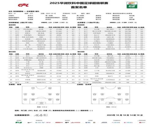 北京时间10月18日16:00,中超第27轮继续进行,北京国安作客肇庆新区体育中心体育场挑战深圳新鹏城,本场主裁判为金京元,VAR裁判为张杨帆,赛前双方首发出炉。