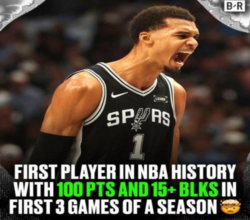 同时,文班亚马还创下了NBA历史第1的神迹。据统计,文班亚马开赛季前三战合计得到至少100分15帽,NBA历史首人。