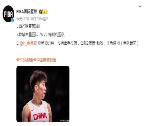 如今根据媒体人导演我躺哪_basketball报道:“正在海外征战西班牙联赛的余嘉豪将暂时离队回国参加即将开始的全运会成年组比赛,浙江队在上一届拿到U22组男篮的铜牌。”